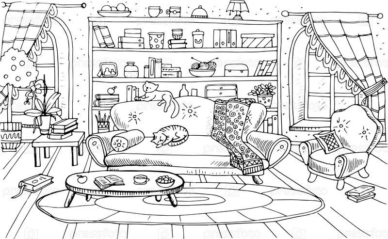Раскраска гостиная и кошки