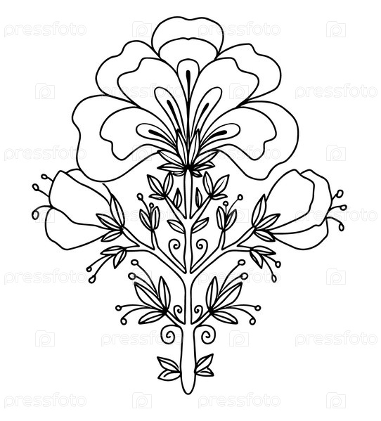 Сказочный цветок, черно-белая контурная иллюстрация, нарисованная от руки, книжка-раскраска с цветком