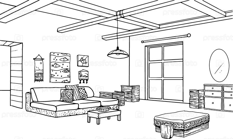 Книжка-раскраска, раскраска домашнего интерьера, комната с интерьером в стиле бохо и минимализма, черно-белый рисунок от руки,