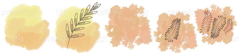 Набор бежевых акварельных пятен, дизайн пятен с растительными элементами