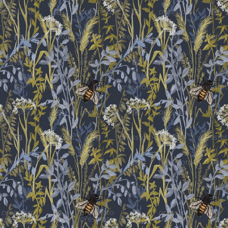 Узор с растениями, травами и полевыми цветами с пчелами