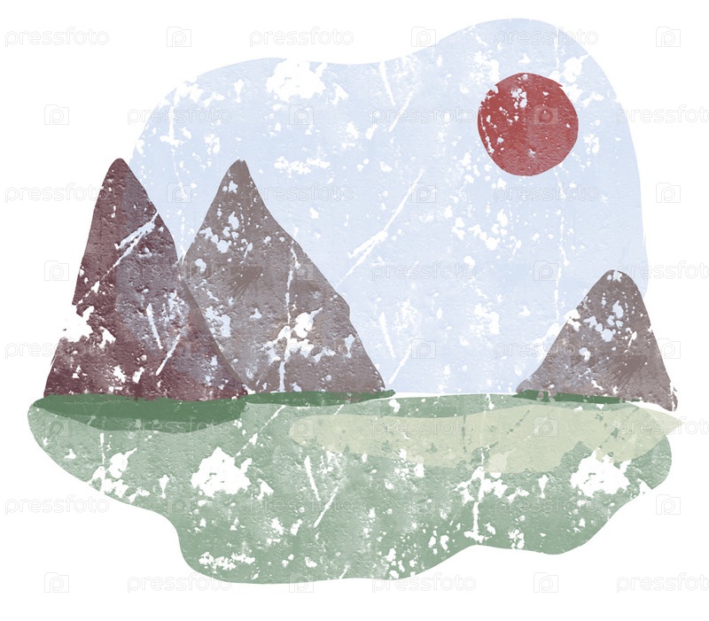 Пейзаж с горами и солнцем, нарисованный вручную с гранжевыми текстурами в холодных тонах, иллюстрация с эффектом штукатурки, живопись мастихином