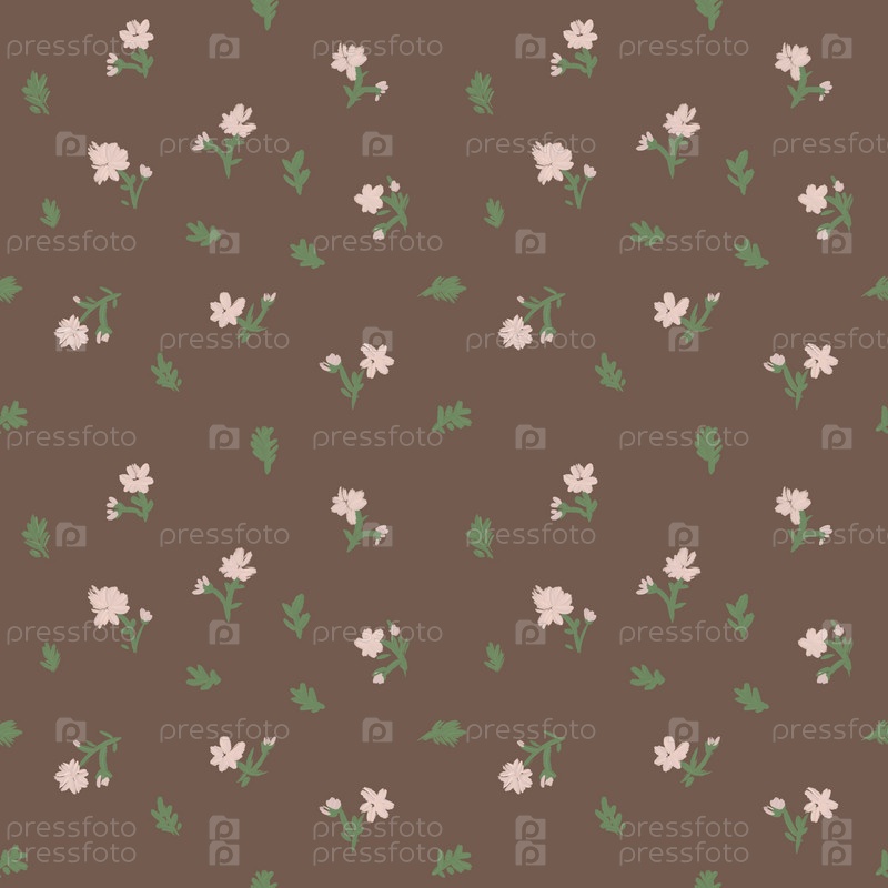 Бесшовный узор розовые маленькие белые цветы на коричневом фоне, рисованная иллюстрация ,