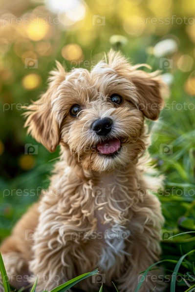 Непослушная кудрявая собака светло-коричневого цвета сидит на траве и смотрит в камеру