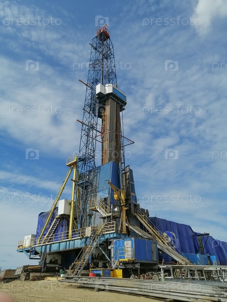 Общий вид конструкции буровой установки для бурения нефтяных и газовых скважин. Нефтяная вышка, оборудование и коммуникации. Бурильные трубы стоят вертикально