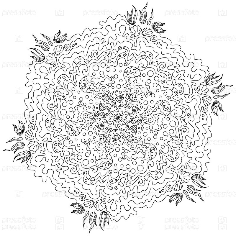 Морская мандала-раскраска с рыбами и медузами
