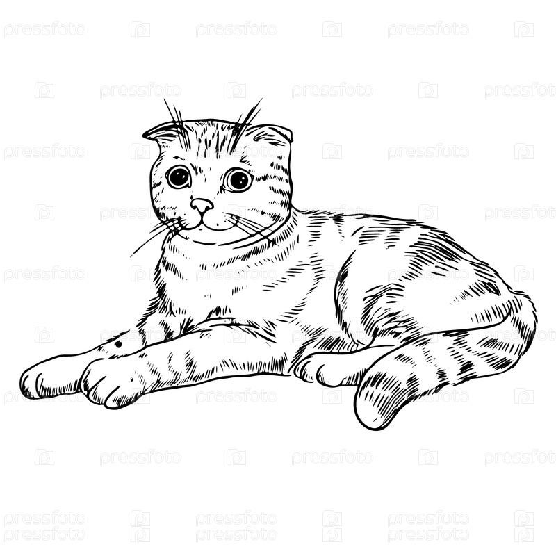 Домашняя кошка, контурный рисунок черно-белый, нарисованный вручную, каракули, иллюстрация для раскраски, логотип животного, изолированный на белом фоне