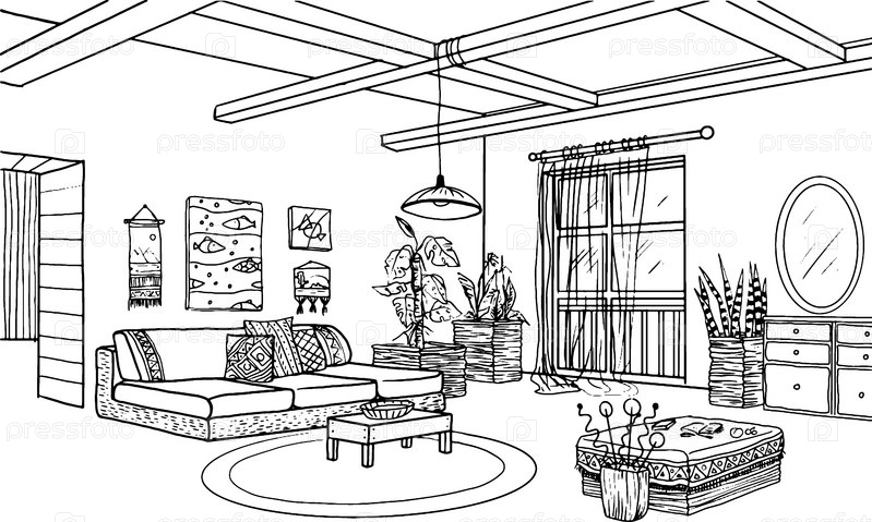 Книжка-раскраска, раскраска домашнего интерьера, комната с интерьером в стиле бохо и минимализма, черно-белый рисунок от руки,