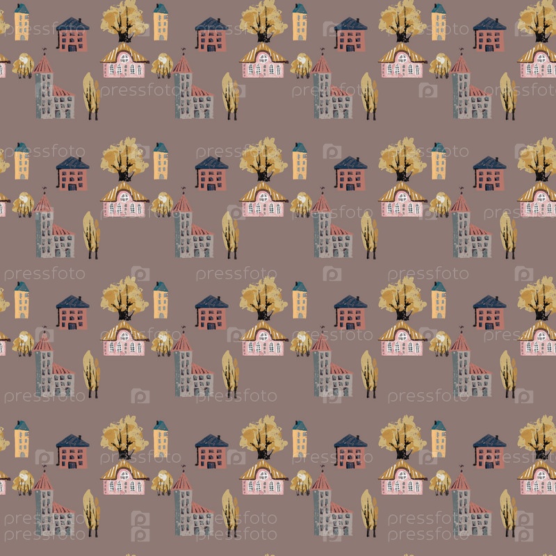 Бесшовный узор с домами и деревьями, осенний городской узор, нарисованный вручную на коричневом фоне, гранж-текстура, фон, ткань, бумага для скрапбукинга
