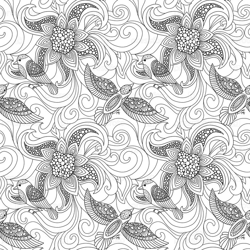Книжка-раскраска, бесшовный узор с птицами среди цветов, контурный ручной рисунок красивых птиц и цветов