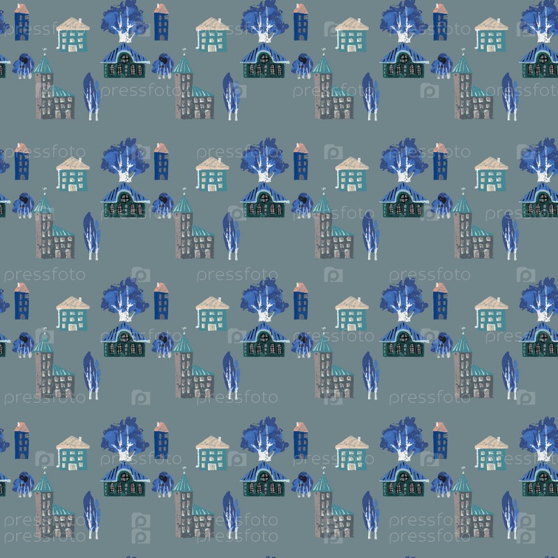 Бесшовный узор с домами и деревьями, осенний городской узор, нарисованный вручную на коричневом фоне, гранж-текстура, фон, ткань, бумага для скрапбукинга