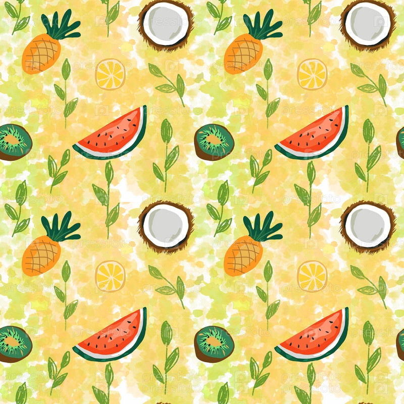 Бесшовный узор с тропическими фруктами, лимоном, ананасом, киви, арбузом и кокосом, яркий фруктовый летний фон, нарисованный вручную