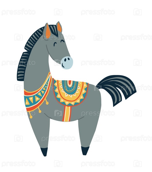 Мультяшная лошадь, нарисованная вручную в стиле бохо, рисунок лошади с этническими орнаментами, плакат для детской комнаты, изолированный клипарт на белом фоне