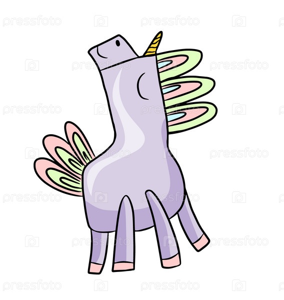 Мультяшный единорог, гордо поднимающий голову, сиреневый цвет, нарисованный вручную персонаж, изолированный на белом фоне