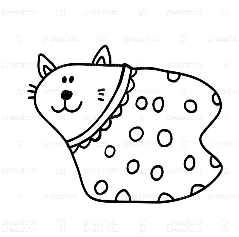 Рисунок забавного кота, нарисованный от руки черно-белыми линиями, контурный рисунок кота, торчащего из сумки