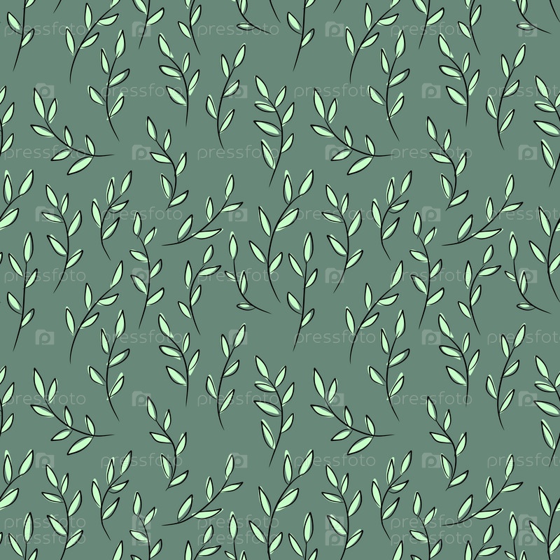 Бесшовный узор с зелеными ветвями и листьями, нарисованный вручную, оливковый фон для дизайна,