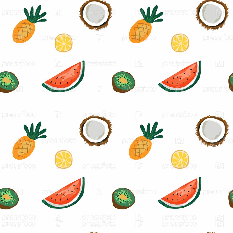 Бесшовный узор с тропическими фруктами, лимоном, ананасом, киви, арбузом и кокосом, яркий фруктовый летний фон, нарисованный вручную