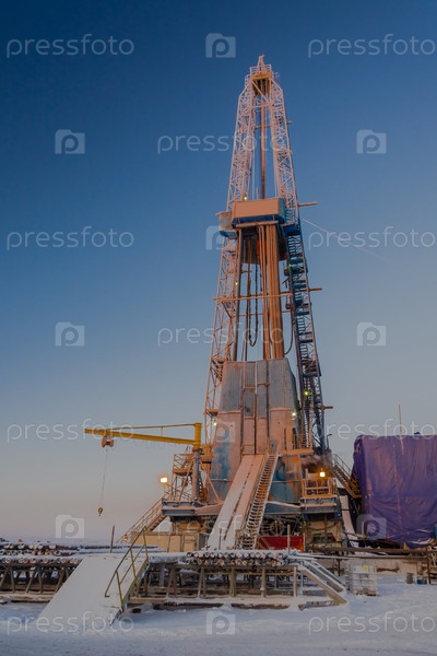 Буровая установка на северном нефтегазовом месторождении. Зимний полярный день. Оборудование и бурильные трубы покрыты снегом