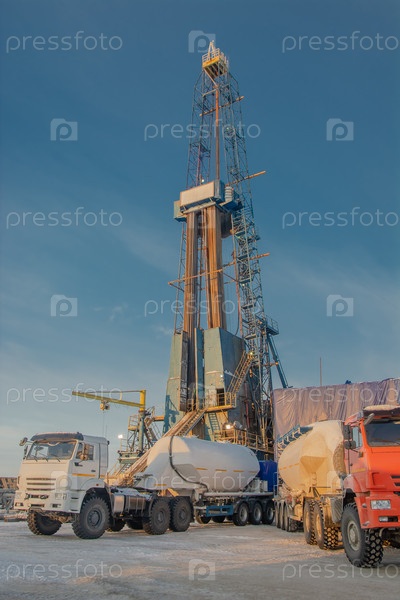 На заднем плане буровая установка на северном нефтегазовом месторождении. На переднем плане – технология тампонажного цементирования обсадной колонны скважины