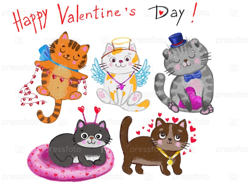 Цветные котики ко Дню святого Валентина клипарт