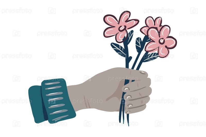 Мужская рука в синем свитере дарит цветы, цветная иллюстрация, нарисованная от руки,
