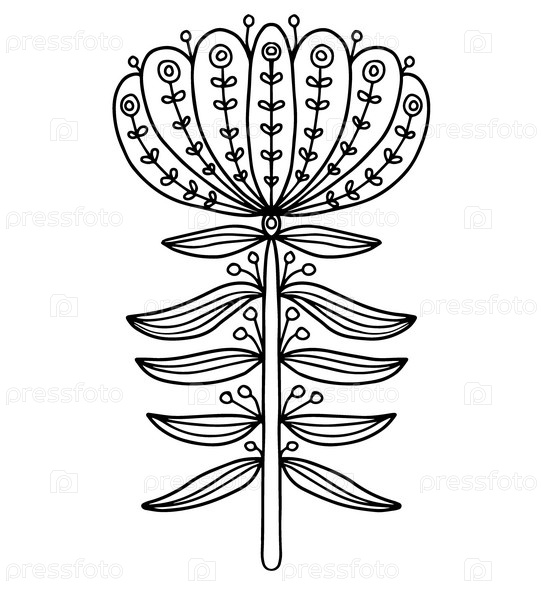 Сказочный цветок, черно-белая контурная иллюстрация, нарисованная от руки, книжка-раскраска с цветком