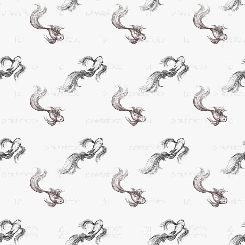 Бесшовный узор с красивой рыбой, плавающей в воде, золотая рыбка, нарисованная карандашами, текстуры, ручная работа, техника рисования, фон, ткань, бумага для скрапбукинга