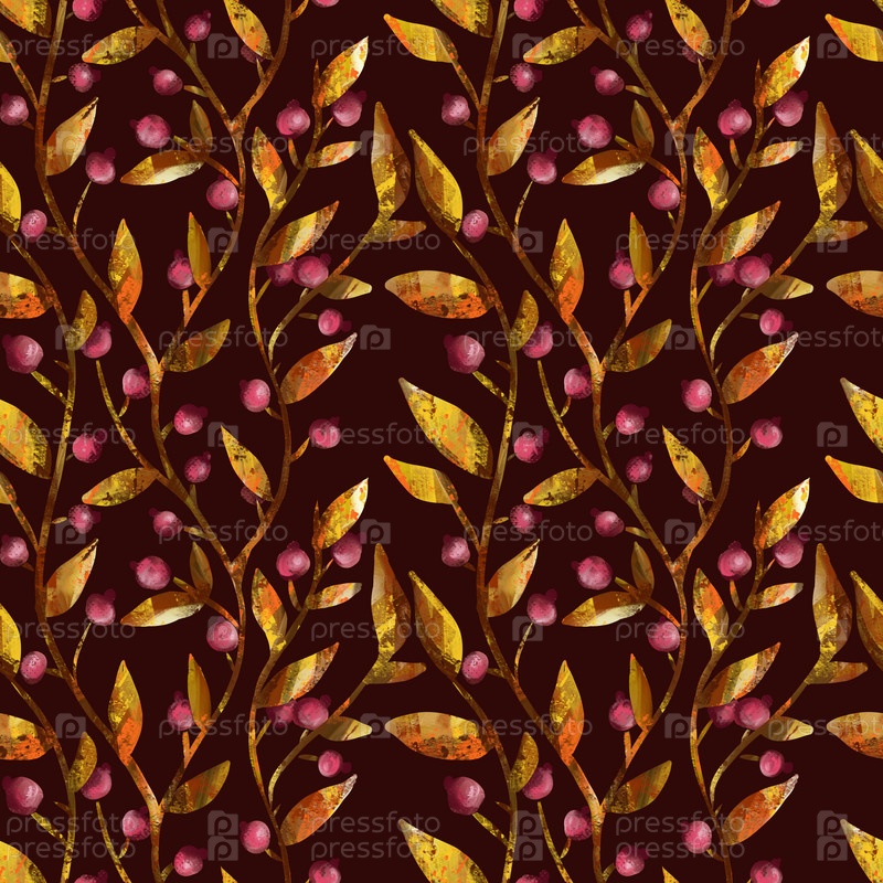 Цветочный бесшовный узор, золотые листья и ветви с ягодами на живописном фоне, нарисованные вручную