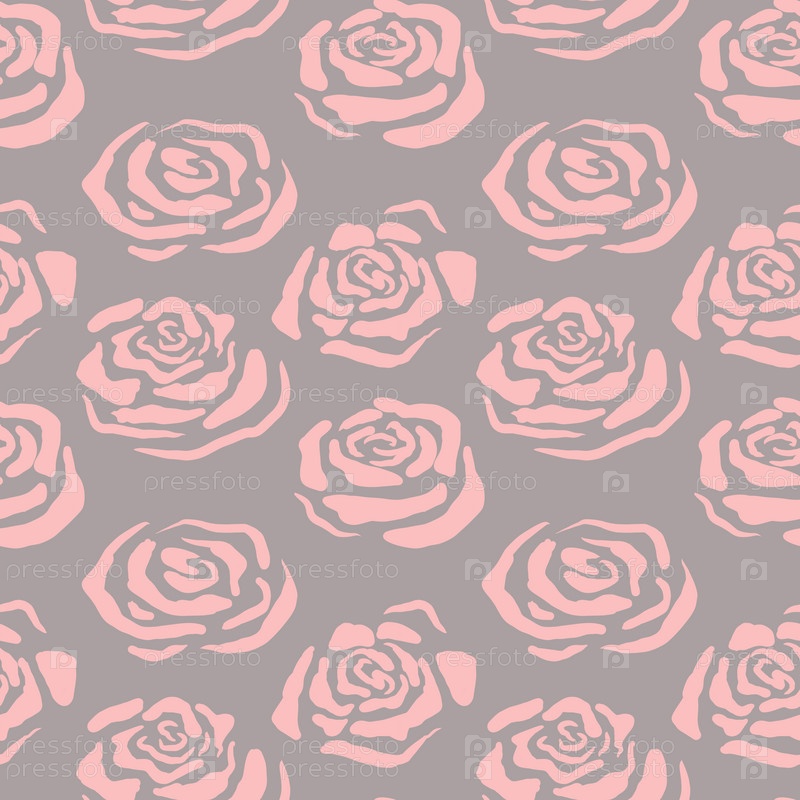 Бесшовный узор с розовыми бутонами роз на сером фоне, абстрактные стилизованные цветы, нарисованные вручную