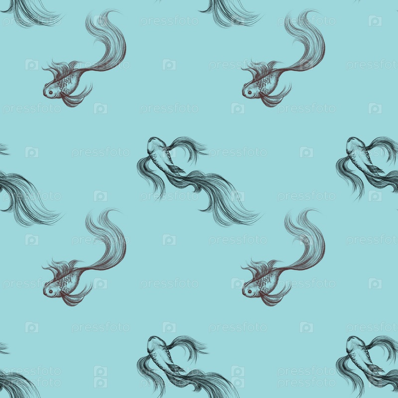 Бесшовный узор с рыбой в воде, золотая рыбка, нарисованная карандашами, текстуры, ручная работа, техника рисования, фон, ткань, бумага для скрапбукинга