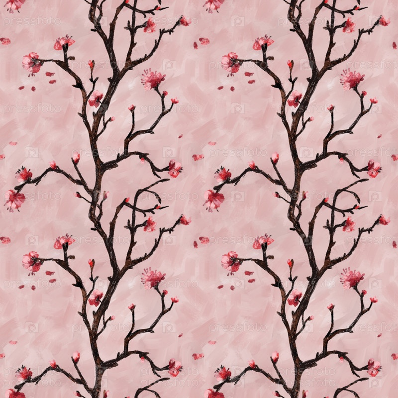 Бесшовный узор с ветвями цветущей вишни, красивый красочный рисунок ручной работы, имитация масляной живописи, белый фон