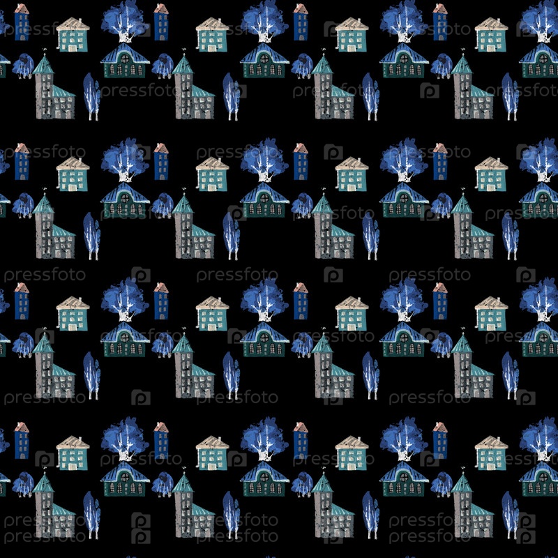 Бесшовный узор с домами и деревьями, осенний городской узор, нарисованный вручную на белом фоне, гранж-текстура, фон, ткань, бумага для скрапбукинга