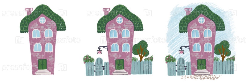 Раскрашенный дом в трех вариантах дизайна, дом, нарисованный цветными карандашами, набор домов разных типов, нарисованная от руки иллюстрация к дизайну, изолированная на белом фоне