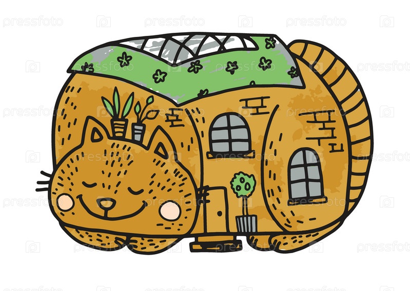 Рисунок забавного кота в виде домика, цветная иллюстрация, нарисованная от руки, рисунок кота, который лежит свернувшись калачиком и изображает дом, домашний кот, улыбающийся
