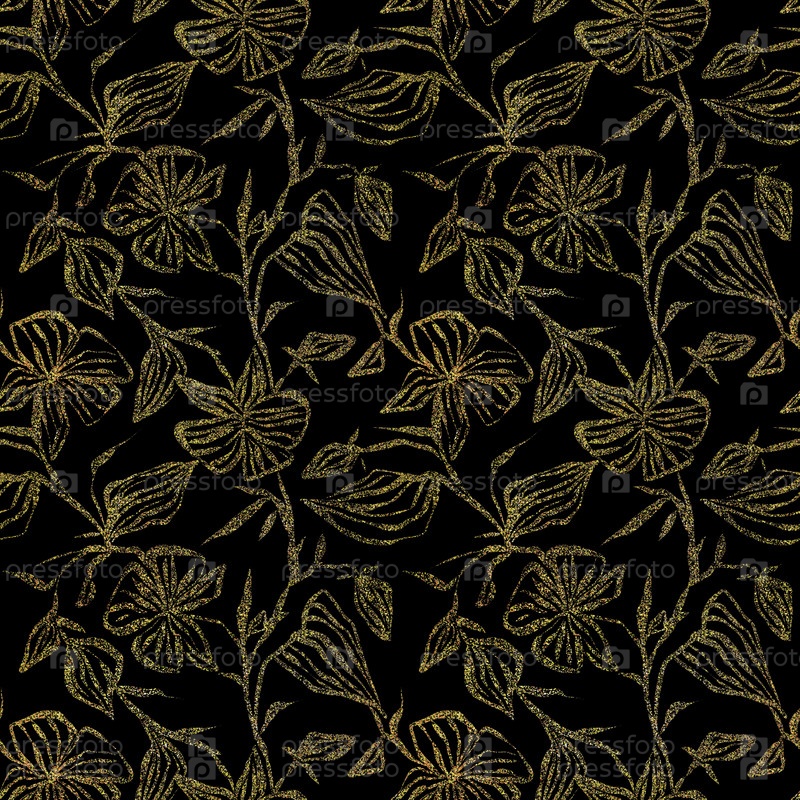 Бесшовный узор с блестящими цветами на черном фоне, контурные цветы из блесток, красивый черный принт, нарисованный вручную