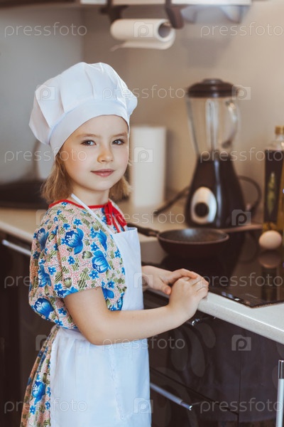 Девушка-повар стоит возле плиты. Мягкий фокус