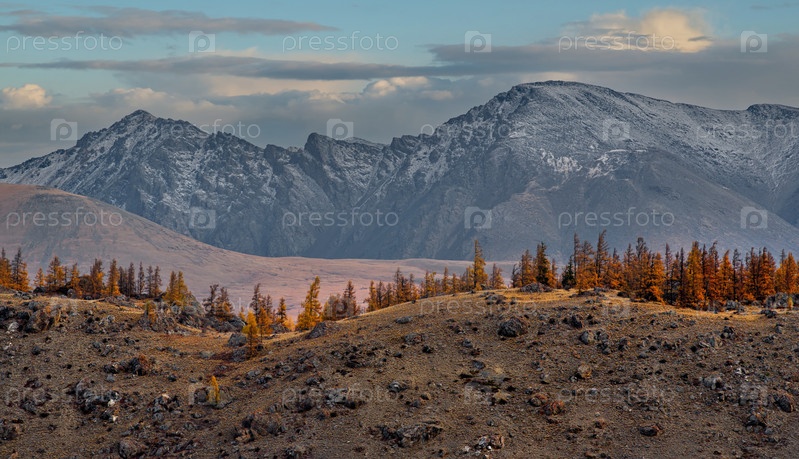 Россия. Юг Западной Сибири, Горный Алтай. Лиственницы в осеннем золоте на вершинах горных хребтов, освещенных вечерними лучами солнца