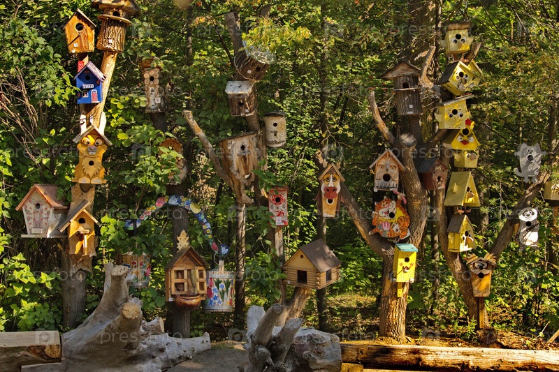 Россия, Новосибирский городской зоопарк. Изготовленные детьми креативные деревянные скворечники на деревьях центральной аллее зоопарка