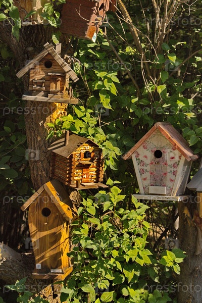 Россия, Новосибирский городской зоопарк. Изготовленные детьми креативные деревянные скворечники на деревьях центральной аллее зоопарка