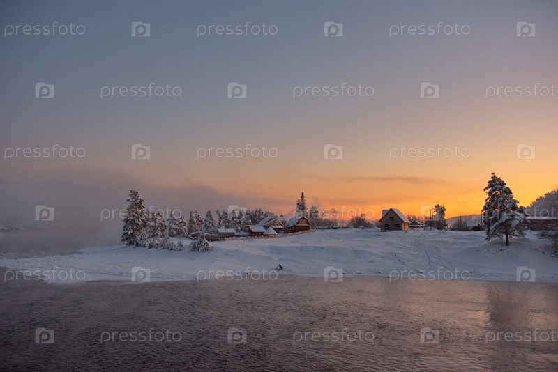 Россия. Юг Западной Сибири, Горный Алтай. Безоблачный морозный пух над незамерзшей, покрытой снегом рекой у села Кебезень