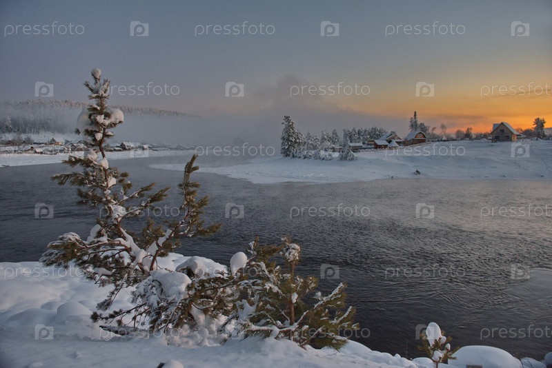Россия. Юг Западной Сибири, Горный Алтай. Безоблачный морозный пух над незамерзшей, покрытой снегом рекой у села Кебезень