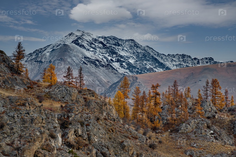Россия. Юг Западной Сибири, Горный Алтай. Лиственницы в осеннем золоте на вершинах горных хребтов, освещенных вечерними лучами солнца