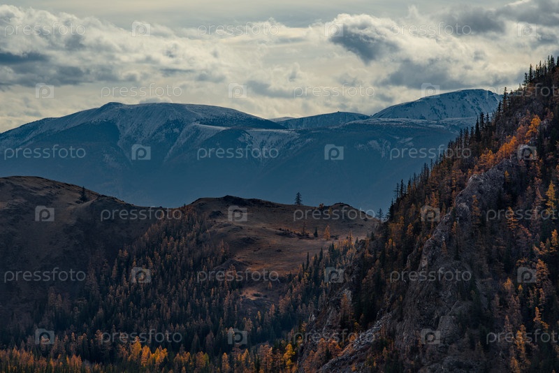 Россия. Юг Западной Сибири, Горный Алтай. Лиственницы в осеннем золоте на вершинах горных хребтов, освещенных вечерними лучами солнца