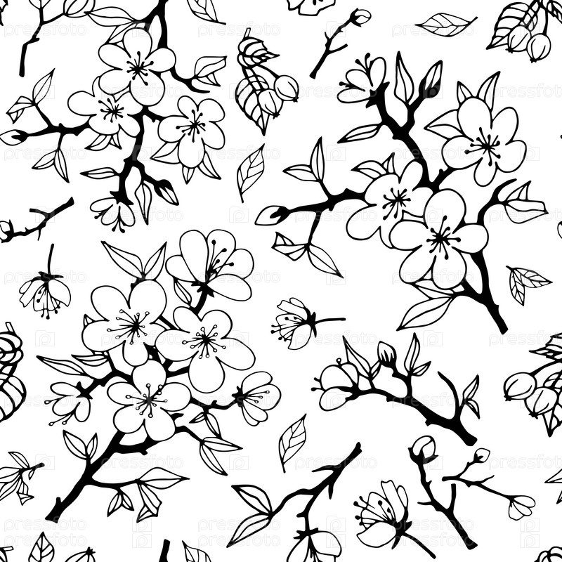 Бесшовный паттерн черно белый с простыми рисунками цветов и листьев яблони, ветки цветущей сакуры