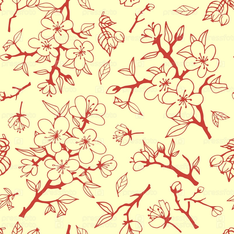 Бесшовный паттерн с ветками и цветами яблони красного цвета на бежевом фоне