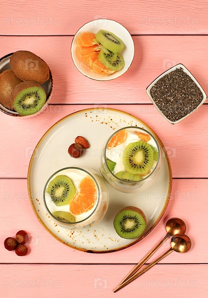 Здоровый завтрак с ингредиентами, фоном с фруктовым йогуртом, киви, мюсли, мандарином и семенами чиа для похудения. Концепция естественного питания и детокс-диеты, образа жизни,