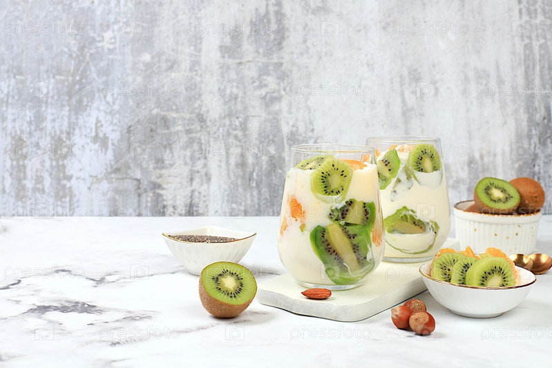 Фруктовый йогурт, киви, мюсли, миндаль, мандарины и семена чиа для похудения. Здоровый завтрак с ингредиентами, кухонный фон. Концепция естественного питания и детокс-диеты, образа жизни,