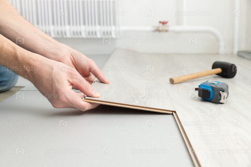 Мужчина кладет на пол ламинат. Напольное покрытие