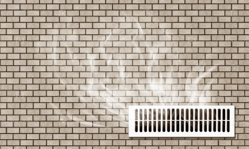 Дым или пар от вентиляционной решетки на кирпичной стене