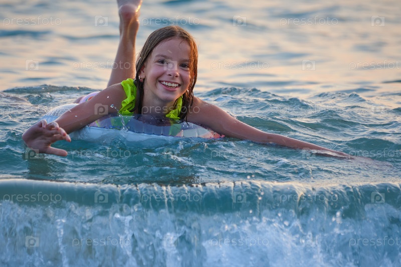 Портрет улыбающегося ребенка, девушки на надувном кольце в море или бассейне